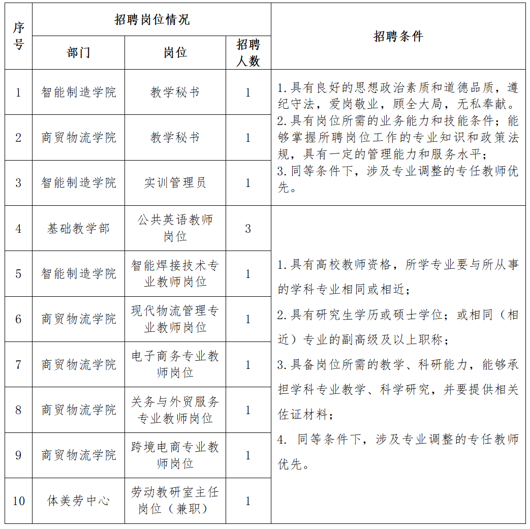 根据《yl23455永利官网教职工校内调动及转岗管理办法(试行)》(津滨职院〔2023〕17号)和《2023年度教职工校内调动及转岗工作实施方案》,结合学校师资队伍现状和发展需要,本着重点保障二级院(部)急需岗位人员配备的原则,经学校党委会研究决定,本次校内招聘岗位、条件及竞聘流程公布如下: