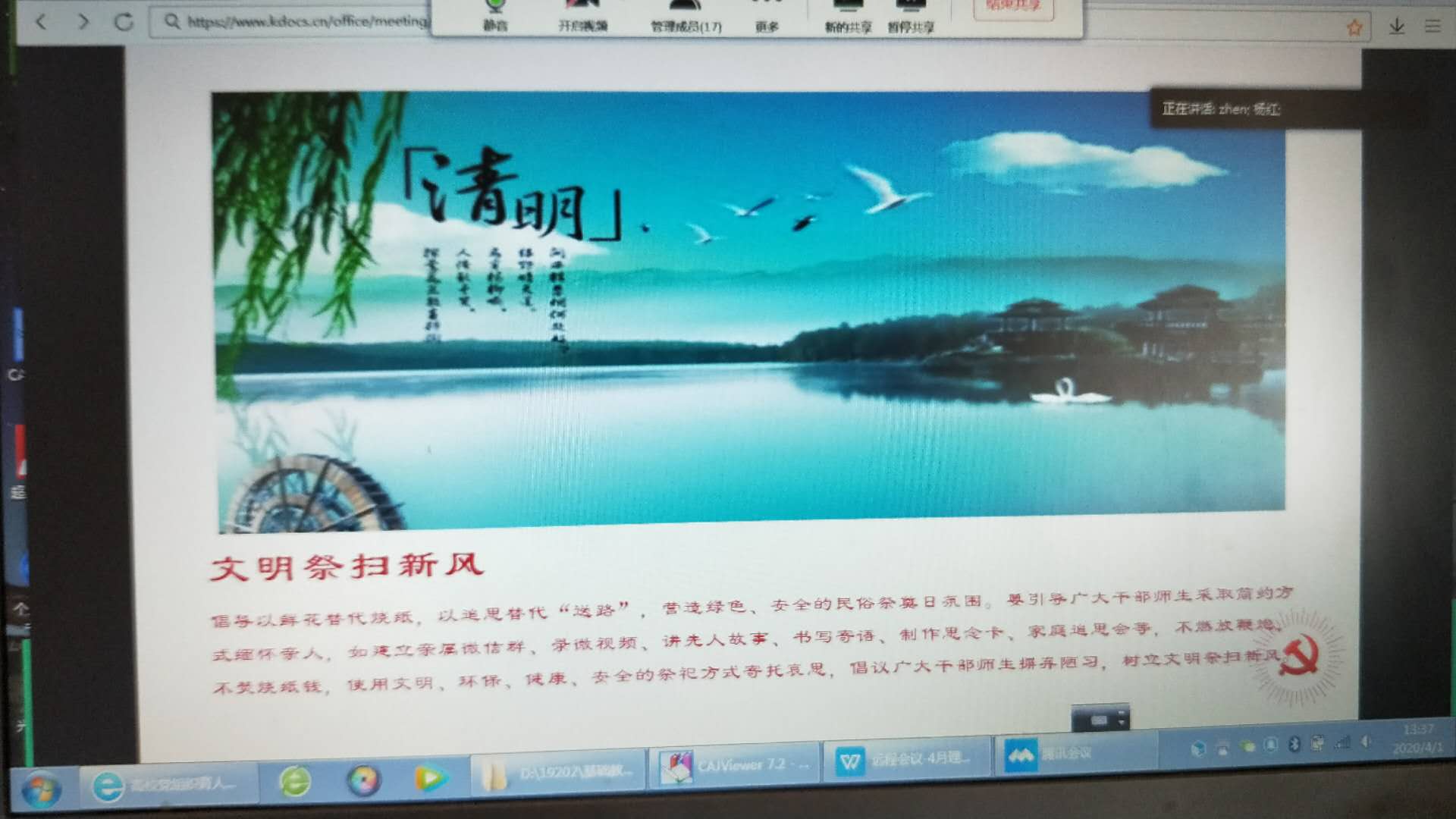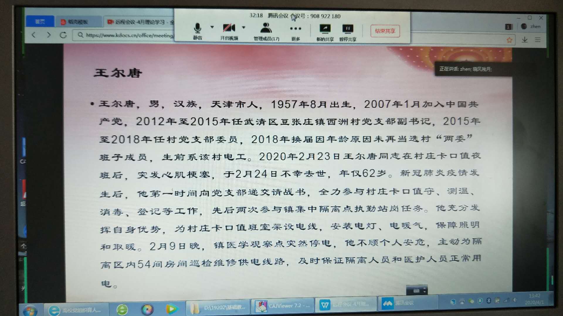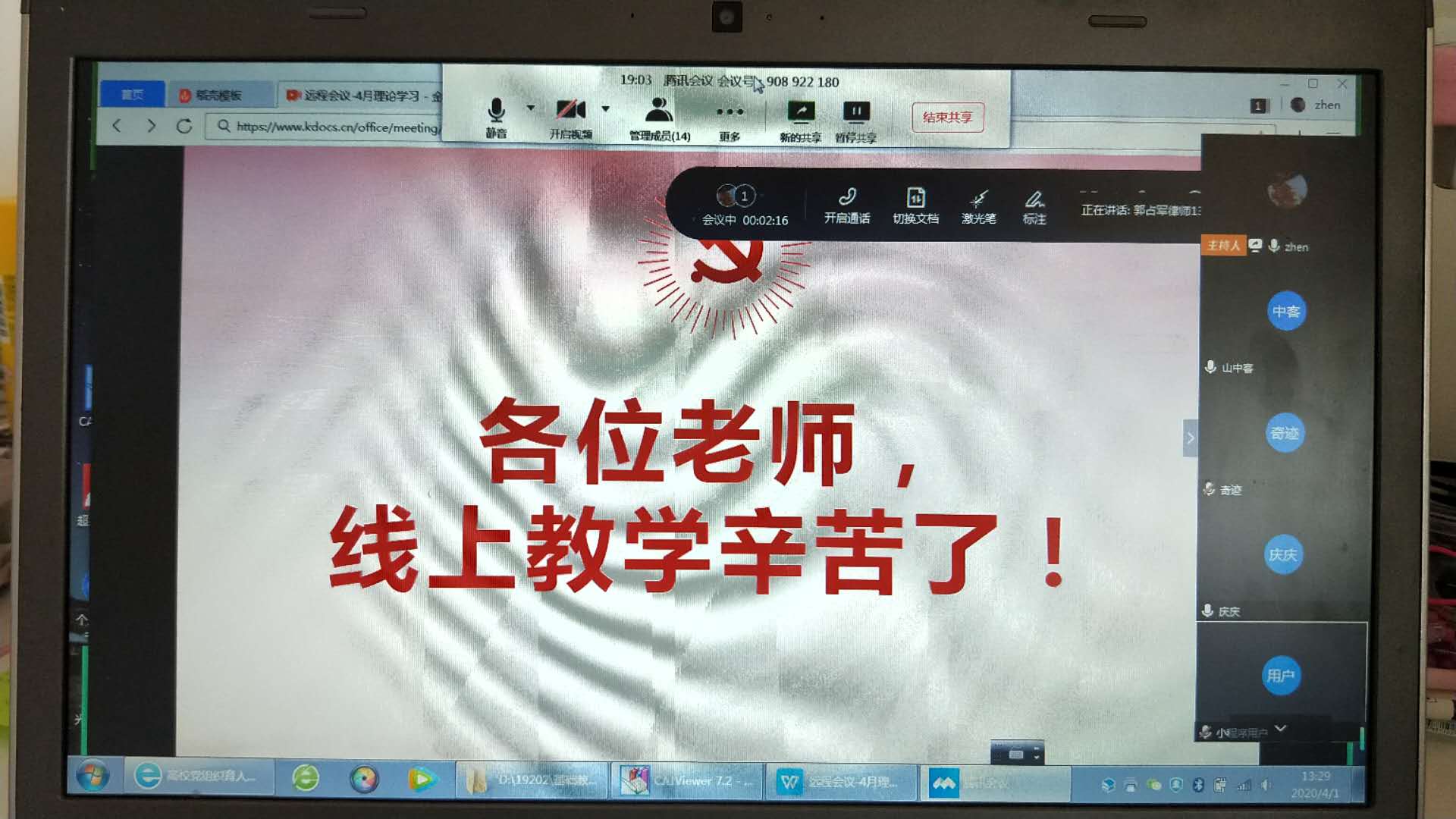 2020年4月1日下午1:30,学院马克思主义学院、基础教学部通过视频会议软件开展本月的理论学习,会议由李玉梅书记主持,两个部门的16名老师参会。