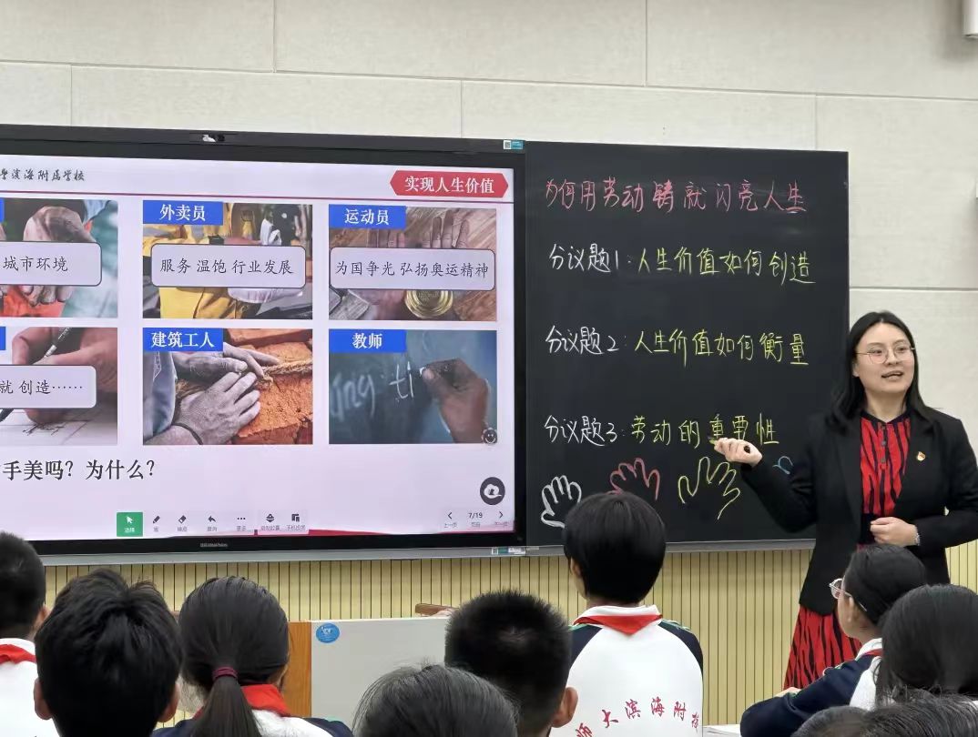 永利官网刘珊老师进一步深入课堂,与附属学校的李佩蓉老师协力合作,共同为7年级的学生们精心打造了两堂别开生面的思政课——《在劳动中创造人生价值》与《从奥运三问体悟不灭的理想之光》。两位老师在教学设计上别出心裁,巧妙融合了现代教育理念与传统教学方法的优势,并积极促进课堂互动,为学生们带来了一堂充满新意与深度的“不一样”思政课。课堂上,学生们被老师们深入浅出的讲解所吸引,不仅认真聆听,还积极举手发言,分享自己的见解与感悟,真正实现了思政教育的“入耳、入脑、入心”。