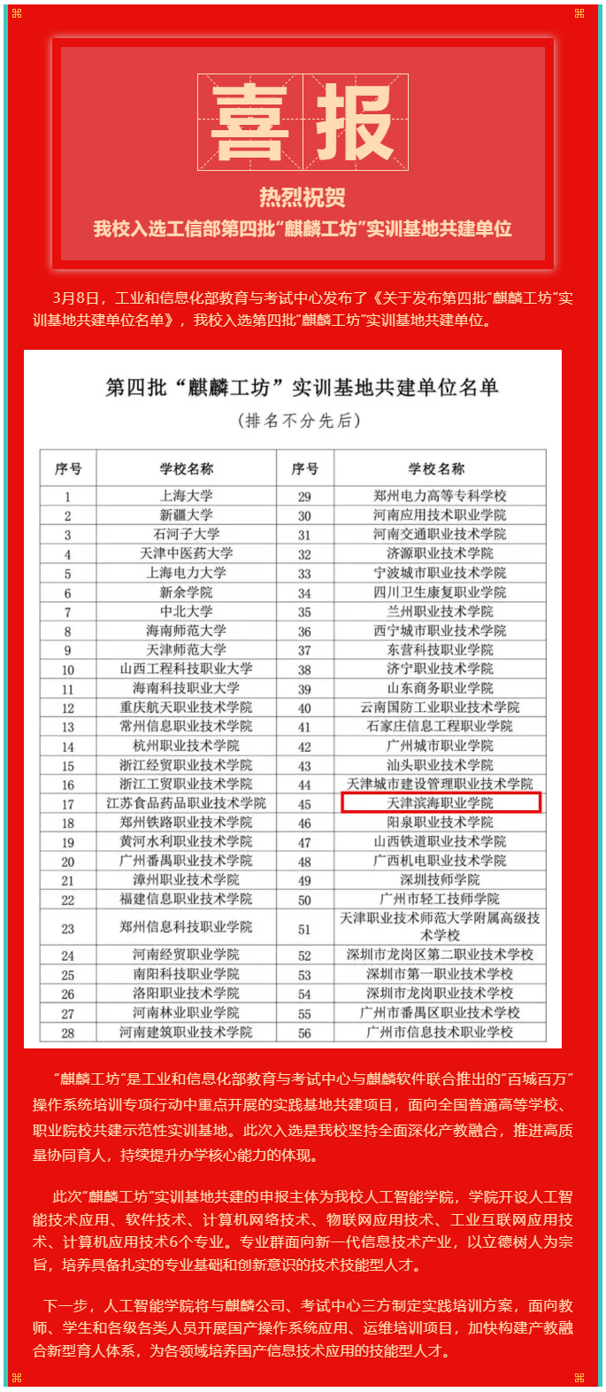 喜报!永利官网入选工信部第四批“麒麟工坊”实训基地共建单位 来源:本站原创 发布时间:2024-03-18 11:38:26 浏览次数: 次 【字体:小 大】 终审:rgznxysh2 分享到: 【打印正文】