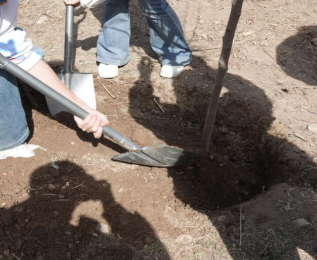 本次活动在图书馆后侧树林种了寓意着事事如意的柿子树。植树的流程看似简单,但只有在真正进行实践时,才会发现这项活动并非如想象中简单:或是坑洞挖得不够深,或是难以确保树苗竖直站立,或是不确定浇下的水是否足够充分……活动现场,师生植树热情高涨,纷纷拿起铁锹,种下一棵棵柿子树。