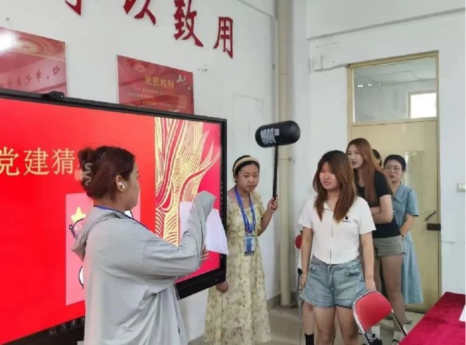 在党建猜猜猜环节,每组入党积极分子依次答题,前方的裁判将显示知识竞猜题目。若选手答对前方的题目,则直接顺延至队伍的最后,等待下一次答题。如果答错题目,则要接受“小锤子”爱的洗礼,小小的惩罚后将重新排到队伍后面等待下一次答题。该环节考验了入党积极分子们对党史知识的掌握程度,同时也增加了活动的趣味性。