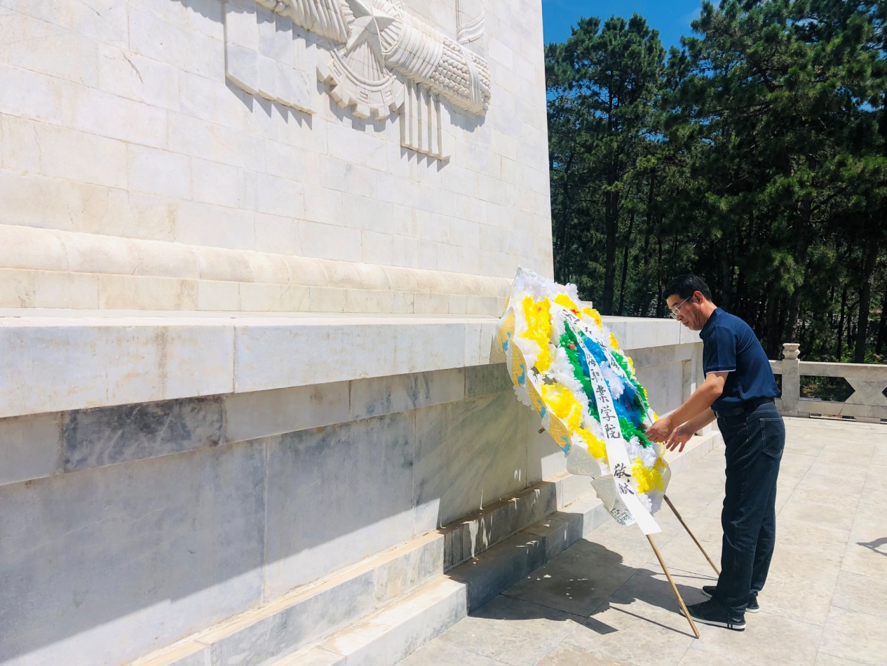 盘山烈士陵园庄严肃穆,“光荣烈士永垂不朽”八个镏金大字光芒耀眼、熠熠生辉。全体党员教师来到烈士纪念碑前,共同奏唱国歌,列队肃立,默哀致敬。后勤资产党支部书记王俊杰、经济管理系党支部书记徐公仁向革命烈士敬献花圈向革命烈士敬献花圈,刘一波副院长整理了花圈挽联,全体党员教师相继走到纪念碑前,绕行纪念碑一周,深情瞻仰烈士纪念碑,缅怀革命先烈的丰功伟绩,表达崇高敬意和缅怀之情。