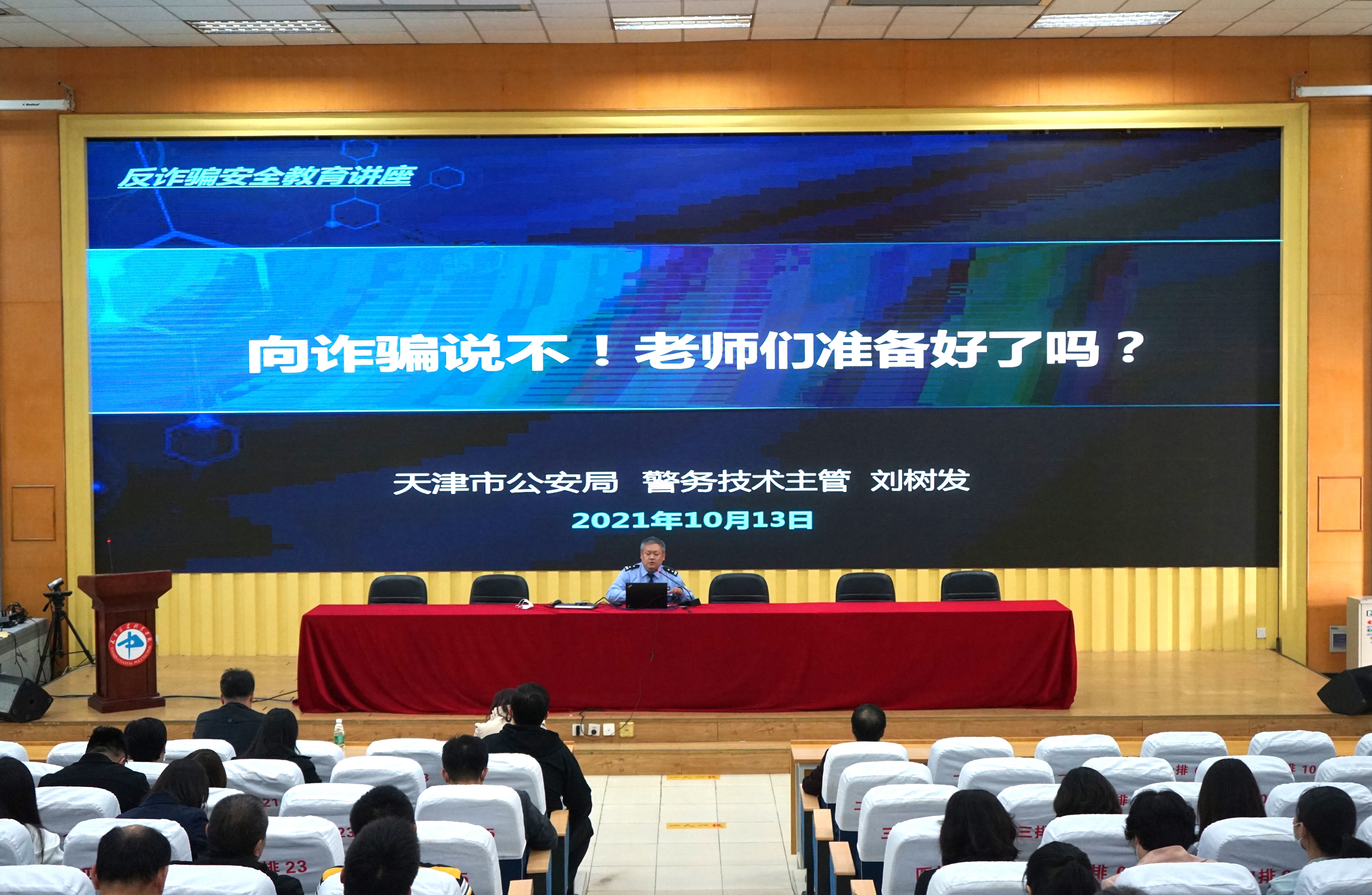为进一步贯彻落实习近平总书记关于网络强国重要论述和市教育两委2021年国家网络安全宣传周工作要求,加强学院师生网络安全教育和管理,普及网络安全相关知识,学院于2021年10月13日下午在报告厅以《向诈骗说不!老师们准备好了吗?》为主题举办网络安全教育专题讲座,特邀请天津市公安局图像侦察和技术防范总队高级工程师刘树发警官主讲。学院党委书记刘雁红同志、副院长王洪军同志及300余名教职工参加。讲座由信息化办公室主任孙烨燃同志主持。