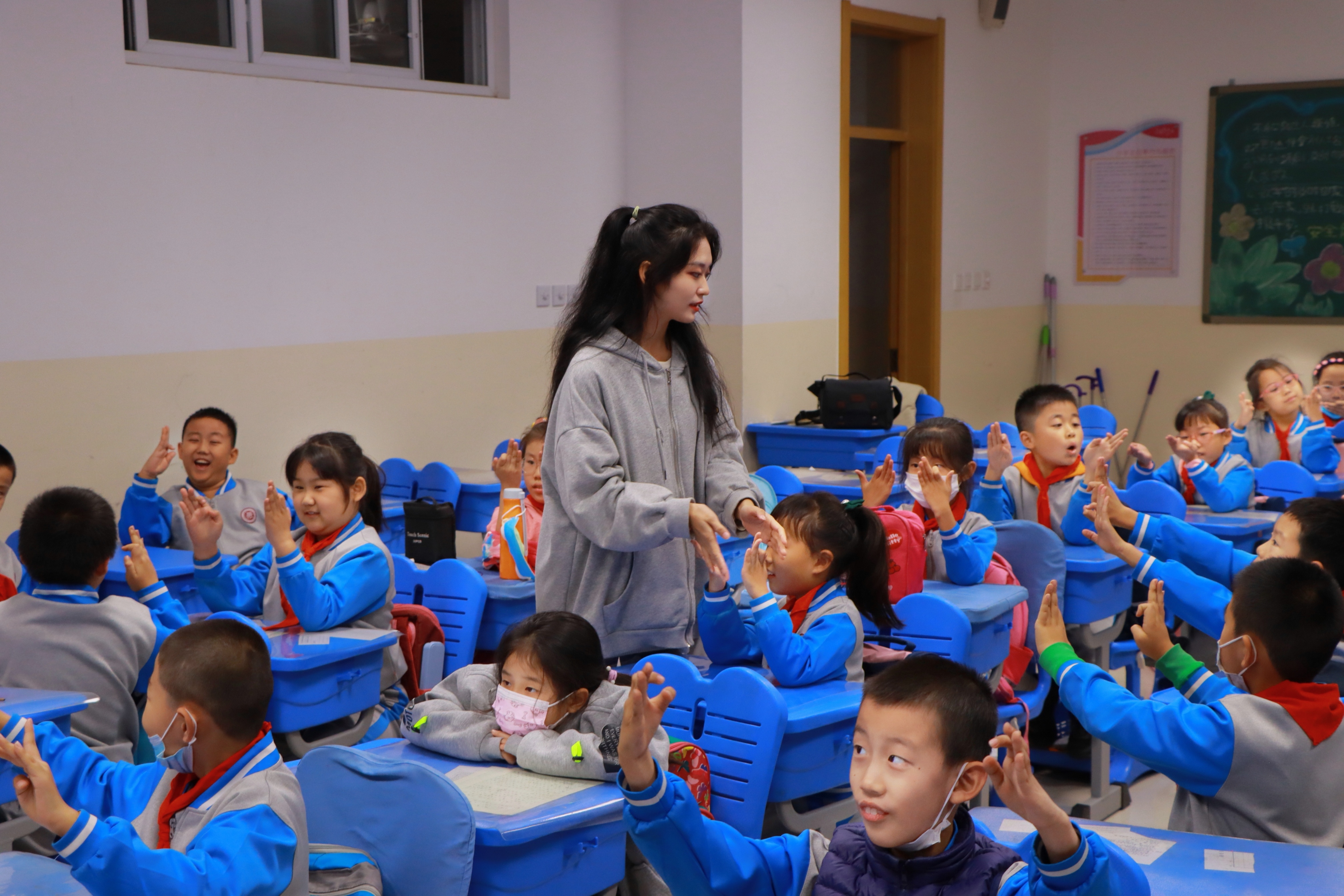 在课后服务过程中,永利官网选拔的优秀学生志愿者按照疫情防控要求,学生志愿者们每周一次进入小学都会佩戴好口罩,穿着大方,严守出勤、准时到校,认真、耐心地为工农村小学和云山道学校的同学们进行课业答疑解惑,并为他们开展了“领学传统文化故事”、“歌曲演唱”、“舞蹈教学”和“棋艺比拼”等文娱活动,开设教育影音、社团兴趣类等课程,进一步培养了孩子们的兴趣爱好。其活动形式丰富多彩,活动内容也别有风趣,孩子们踊跃参与、兴趣盎然,好评如潮。大学生与小学生在课堂上积极互动,用热情、爱心以及正能量点燃了课堂的氛围,这些“大哥哥”、“大姐姐”为孩子们树立了良好的“小老师”形象,也充分诠释了学院“崇德尚能 学以致用”的校训精神,展示了学院优秀的育人成果。