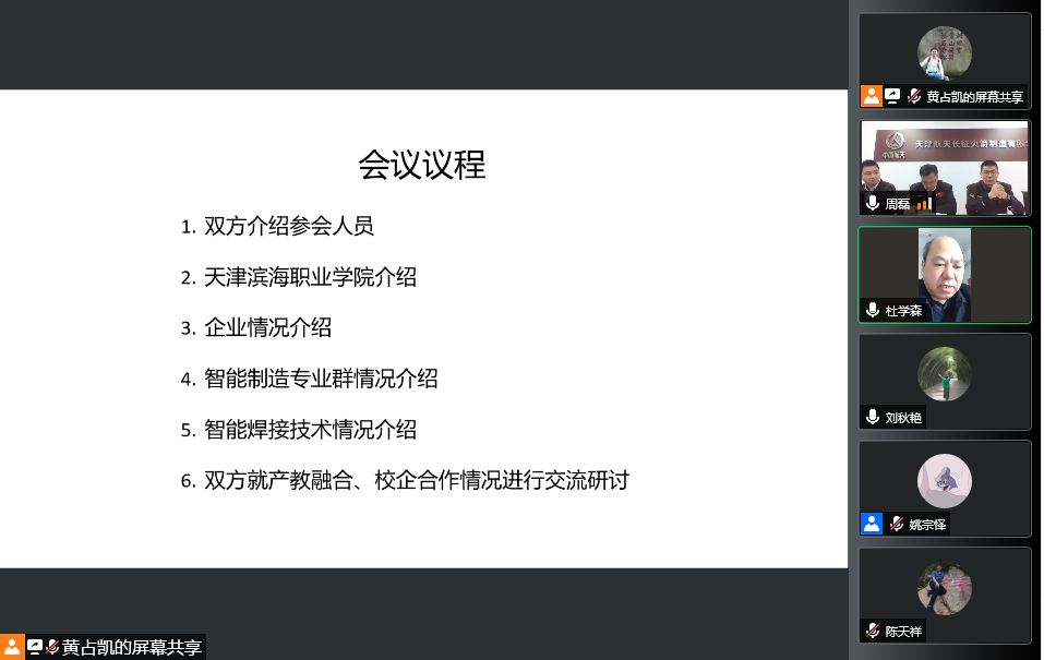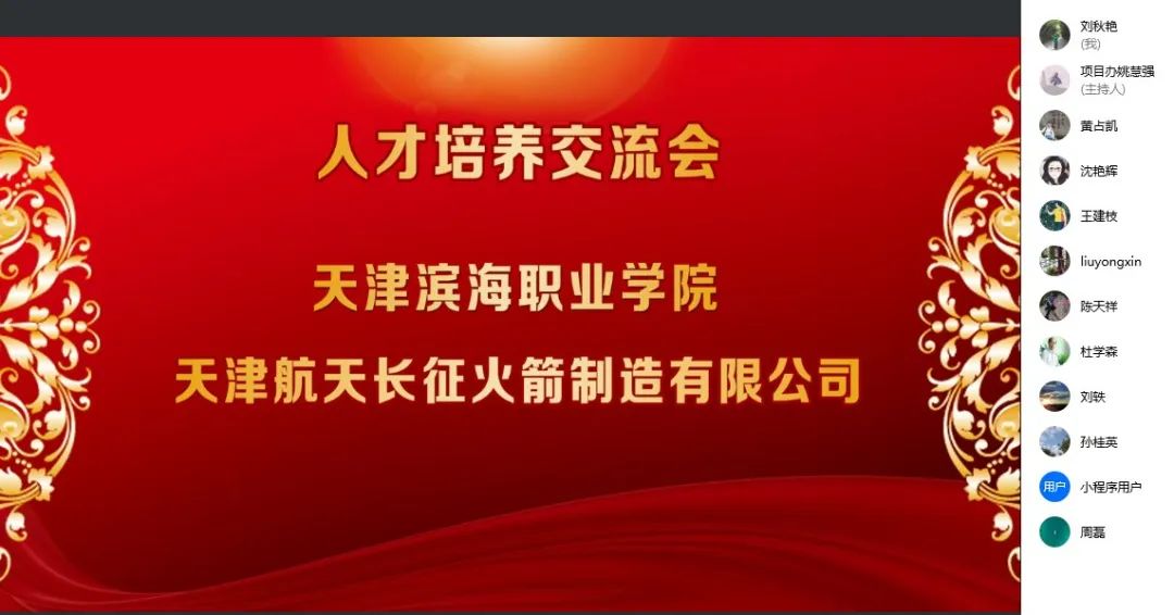 为全面贯彻落实教育部、天津市人民政府《关于深化产教城融合,打造职业教育创新发展标杆的意见》,学院智能制造专业群紧跟天津职业教育创新发展的快车道,主动融入滨海新区“1+3+4”产业内涵建设,积极探索校企合作人才培养的创新发展之路。2022年3月25日,在中国教育在线编辑黄占凯老师牵线组织下,学院与天津航天长征火箭制造有限公司以线上会议方式,共同研讨产教融合、校企合作人才培养相关事宜。天津航天长征火箭制造有限公司人力资源处处长王兴友、焊接车间主任高文静、副主任刘含伟、项目办姚慧强、姚宗泽、刘轶等相关领导以及学院党委书记王建枝、党委副书记、院长杜学森和教务处及机电工程系部门领导、焊接教研室主任老师参加了研讨会。会议由机电系副主任沈艳辉主持。