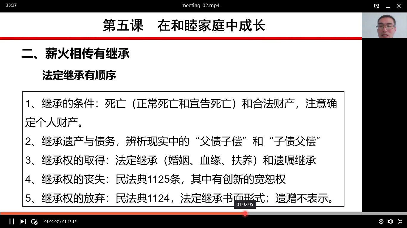 武奎老师今天主讲内容是高二法律与生活(第二单元)内容。第四课侵权责任与权利界限。从侵权概念、构成条件、责任承担方式、诉讼时效、归责原则方面;第五课在和睦家庭中成长,从家庭、家风、家教的构建,从对未成年人抚养教育保护及监护人顺序职责、老年人的赡养、监护及禁止行为规定到继承等;第六课珍惜婚姻关系,从社会发展角度谈爱情婚姻必要性及结婚离婚条件、禁止性条件等方面进行了讲解。武老师的讲述概念准确、梳理法条细致全面,案例生动精彩。他不仅讲述教材内容,还拓展相关内容;不但讲解理论内容,而且还推荐教法讲授如何选取案例。