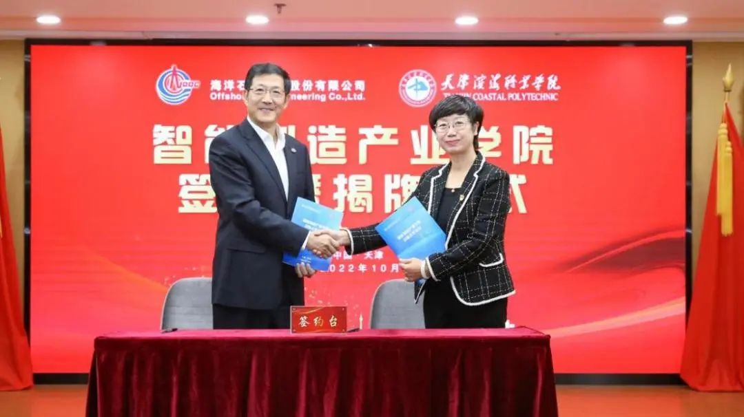 2022 年10月19日,yl23455永利官网与海洋石油工程股份有限公司共建“智能制造产业学院”合作签约暨挂牌仪式在海洋装备产业(人才)联盟工作会议上举行。天津市滨海新区区委常委、组织部部长宋哲,副部长高杰,区委组织部人才工作综合室主任曹辉,滨海新区教体局副局长吴英元,学校党委书记王建枝,党委副书记、校长杜学森,智能制造学院负责人,海洋石油工程股份有限公司董事长、党委书记于毅,总裁、党委副书记王章领,天津海洋装备产业(人才)联盟成员单位领导等参加了活动。