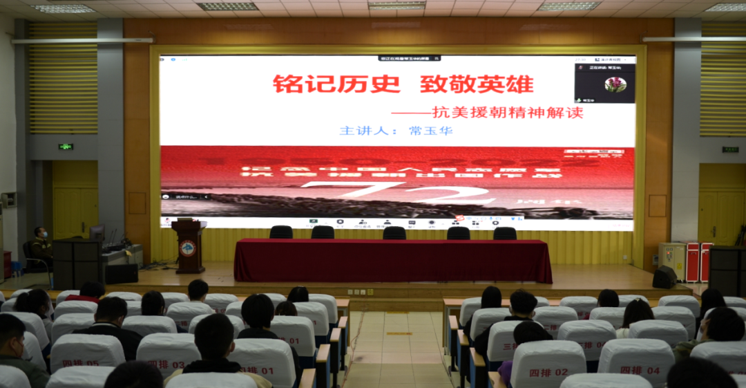 为深入学习贯彻党的二十大精神,更加紧密地团结在以习近平同志为核心的党中央周围,坚持不懈以习近平新时代中国特色社会主义思想铸魂育人,2022年11月22日,马克思主义学院邀请天津市2022年“学史铸魂担使命 星火相传砺初心”思想政治理论教授团成员常玉华教授为我们作《铭记历史 致敬英雄——抗美援朝精神解读》的主题宣讲。马克思主义学院书记、院长李玉梅同志主持会议,来自六个二级学院的70余名学生代表以及部分思政课教师参加了此次会议。