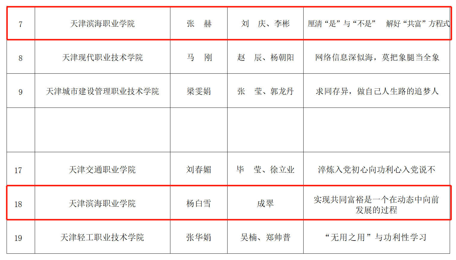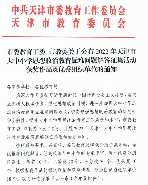 近期,在天津市教育工委市教委组织的“关于开展2022年天津市大中小学思想政治教育疑难问题解答征集活动”中,永利官网马克思主义学院思政课教师取得可喜成绩。张赫老师团队、杨白雪老师团队获二等奖,李彬老师团队、李钦红老师团队获三等奖,成翠老师团队、冯雪老师团队获优秀奖,永利官网获得本次活动优秀组织单位奖。