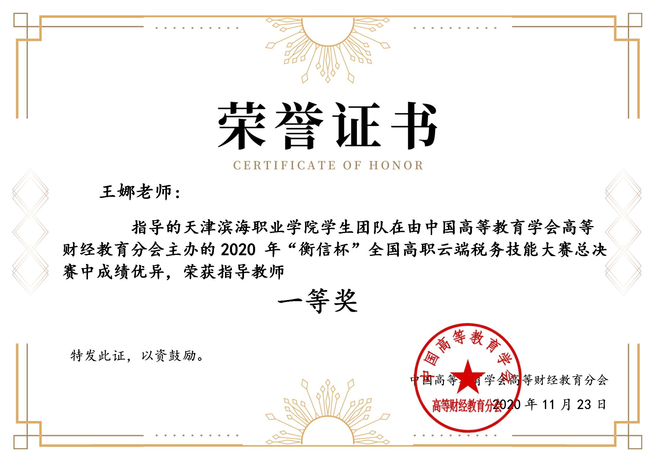 2020年11月21日,2020年“衡信杯”全国高职云端税务技能大赛总决赛在线上举行,永利官网会计专业张玲、毛智慧、李素素三位同学组成的代表队在王娜老师的指导下,获得“衡信杯”全国高职云端税务技能大赛总决赛一等奖,王娜老师荣获指导教师一等奖。