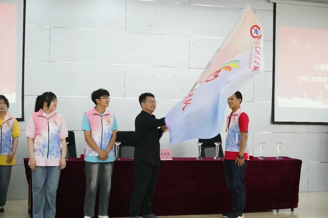 副校长王洪军为“护心志愿者团队”授旗