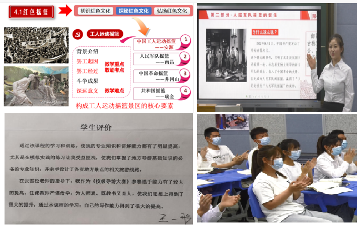 红色精神中承载着“江山就是人民,人民就是江山”的初心使命,本案例主要将旅游景区涉及的红色资源如南昌起义、创建井冈山革命根据地等党史事件变成教育教学中的“活教材”,通过深挖景区旅游资源所蕴含的育人要素,将延安精神、井冈山精神、长征精神等红色精神融入到《导游基础知识》课程教学中,构建师生心中有情怀、红色基因有传承、课堂教学有引领、策略实施有温度的“四有”课堂,在潜移默化中将思政之“盐”溶于课程之“汤”,进而发挥红色精神引领人、感化人、激励人的育人实效,提升课堂活力。