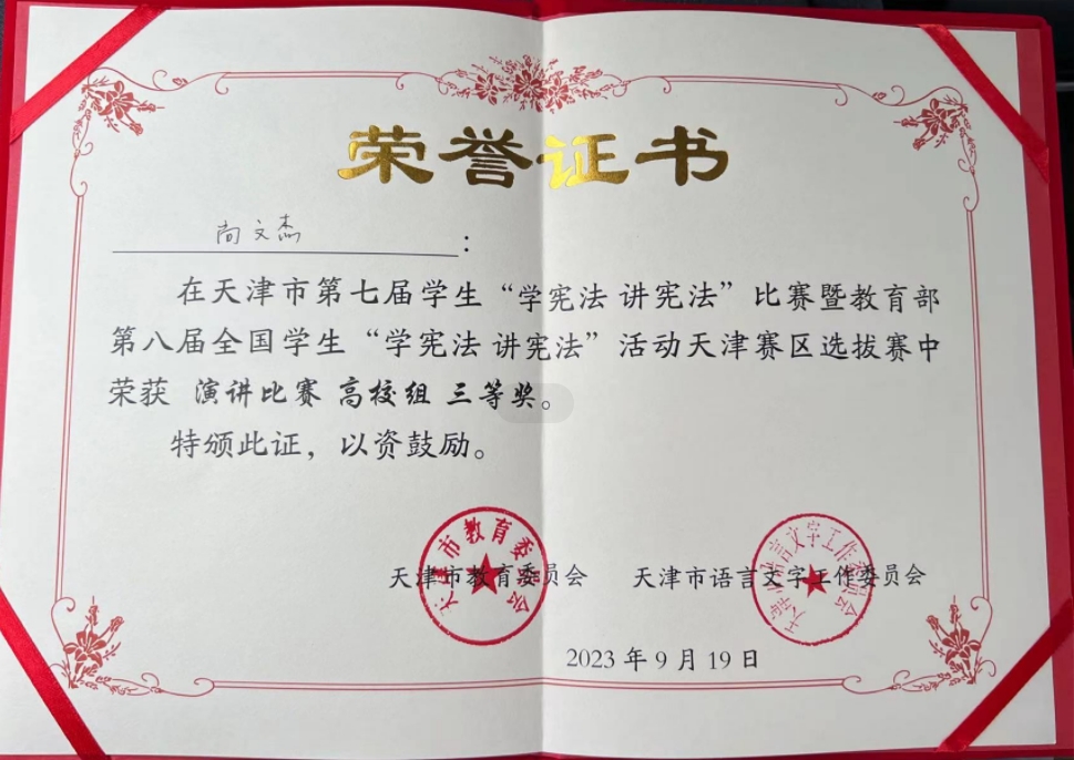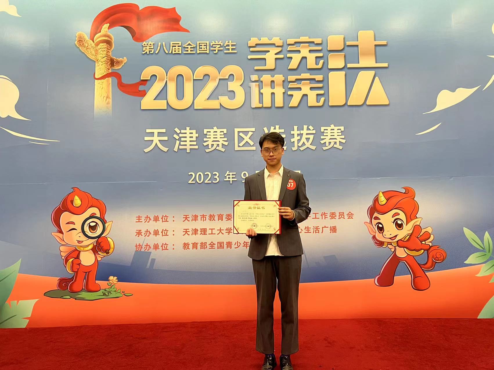 天津市第七届学生“学宪法 讲宪法”比赛暨教育部第八届全国学生“学宪法 讲宪法”活动天津赛区选拔赛于2023年9月19日在天津理工大学开赛,本次比赛共分为小学组、初中组、高中(中职)组、高校组,经过初赛选拔、复赛和决赛,永利官网师生不忘初心、奋勇拼搏,由马克思主义学院李彬老师指导的尚文杰同学和武奎老师指导的王峥同学,分别获得天津市三等奖和优秀奖。